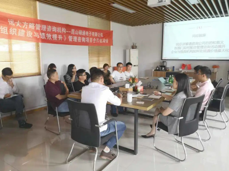 昆山碩通電子有限公司(以下簡稱“碩通電子”)攜手遠大方略啟動《組織建設(shè)與績效提升》管理改善項目。遠大方略項目總監(jiān)劉老師、遠大方略咨詢師呂老師入駐碩通電子,通過前期對碩通電子公司的深入調(diào)研與探討,本期項目主要圍繞企業(yè)現(xiàn)狀診斷、管理者角色轉(zhuǎn)型、組織結(jié)構(gòu)優(yōu)化、崗位職責(zé)優(yōu)化、薪酬體系優(yōu)化、績效體系優(yōu)化、年終獎方案等展開改善。