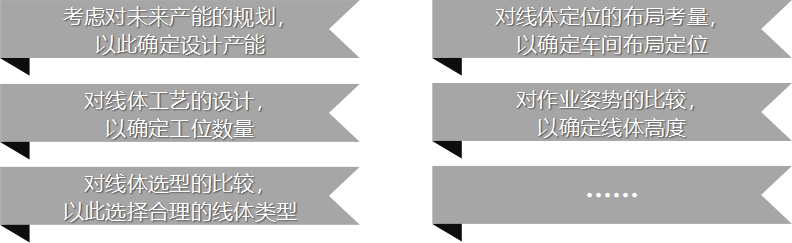 在線體規劃設計項目中,我們會充分考慮對未來產能的規劃,以此確定設計產能;對線體工藝的設計,以確定工位數量;對線體選型的比較,以此選擇合理的線體類型;對線體定位的布局考量,以確定車間布局定位;對作業姿勢的比較,以確定線體高度;對尺寸骨架的設計,以確定主體尺寸;對工裝吊架設計的考慮,以確定吊架方式選擇;對工位詳細布局,通過工藝模擬驗證;對輔助設施設置的考慮,以滿足特殊需求;對外部接口的考慮,以提前預留對外施工接口。以實現線體規劃的有效性及合理性。